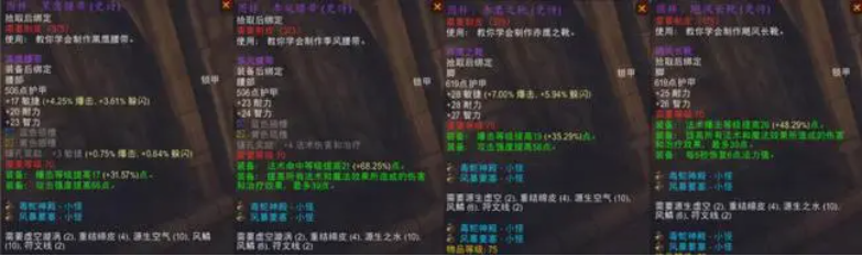 2、锁甲。锁甲包括物理和法系DPS腰带和鞋子,元素萨不缺命中腰带比较尴尬,增强萨BIS装是皮甲可以无视,猎人必做一条腰带,漩涡太贵的话就别做鞋子了。