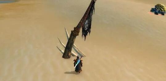3.到达天涯海滩后,找到坐标(55,95)处即可看见沙滩上有一面海盗旗,海盗旗包含了旗子和旗杆,海盗旗就和三根骨头靠在一起。