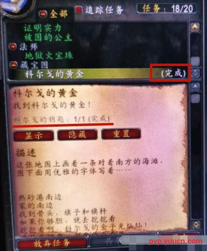 1.打开魔兽世界游戏的任务日志,可以看到科尔戈的黄金任务需要找到有骨头、旗子和旗杆的地方,然后找到钥匙开箱。